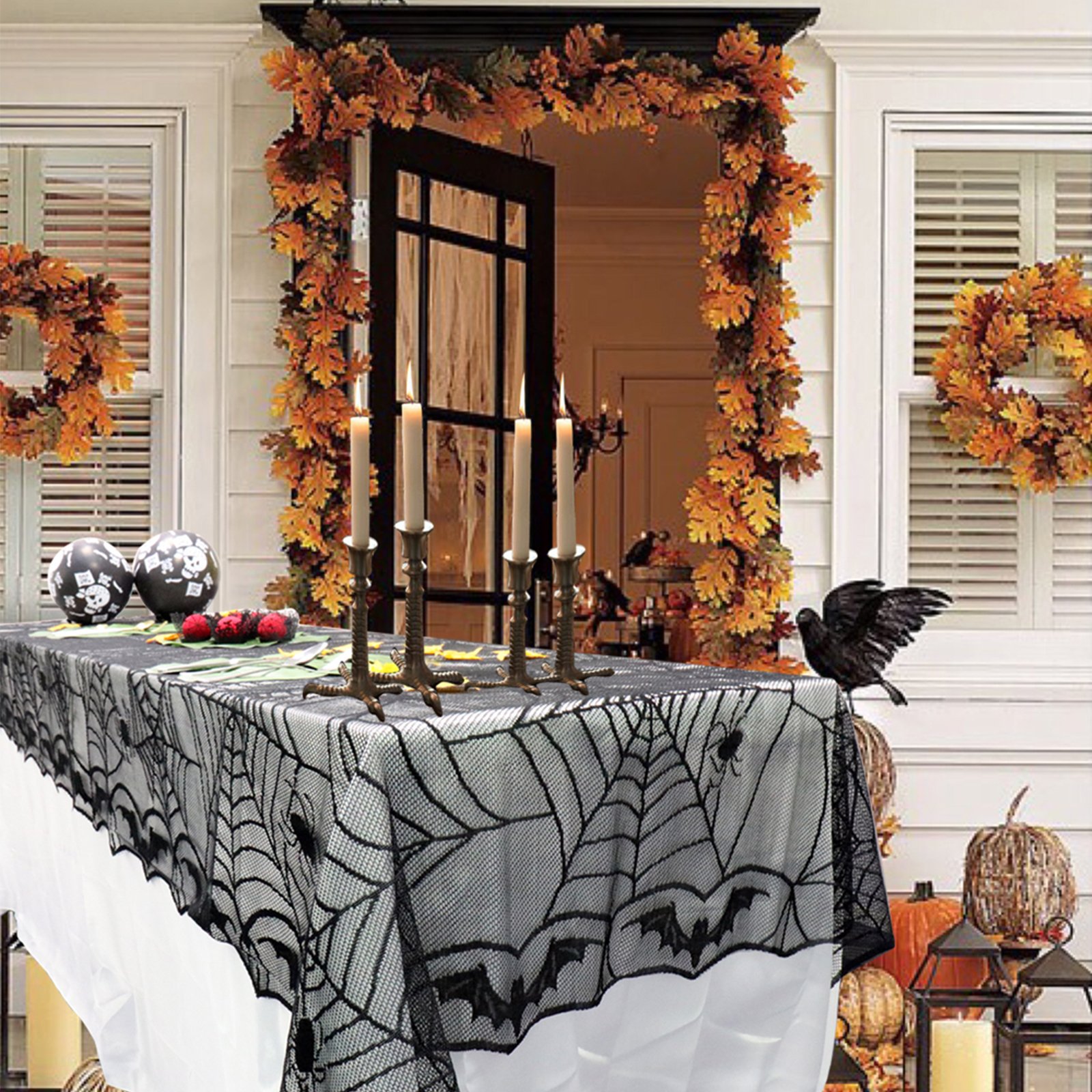 Set pumpkins atop our table topper to create spooky Halloween scenes with decorative spiders and creepy cobwebs in your haunted house
